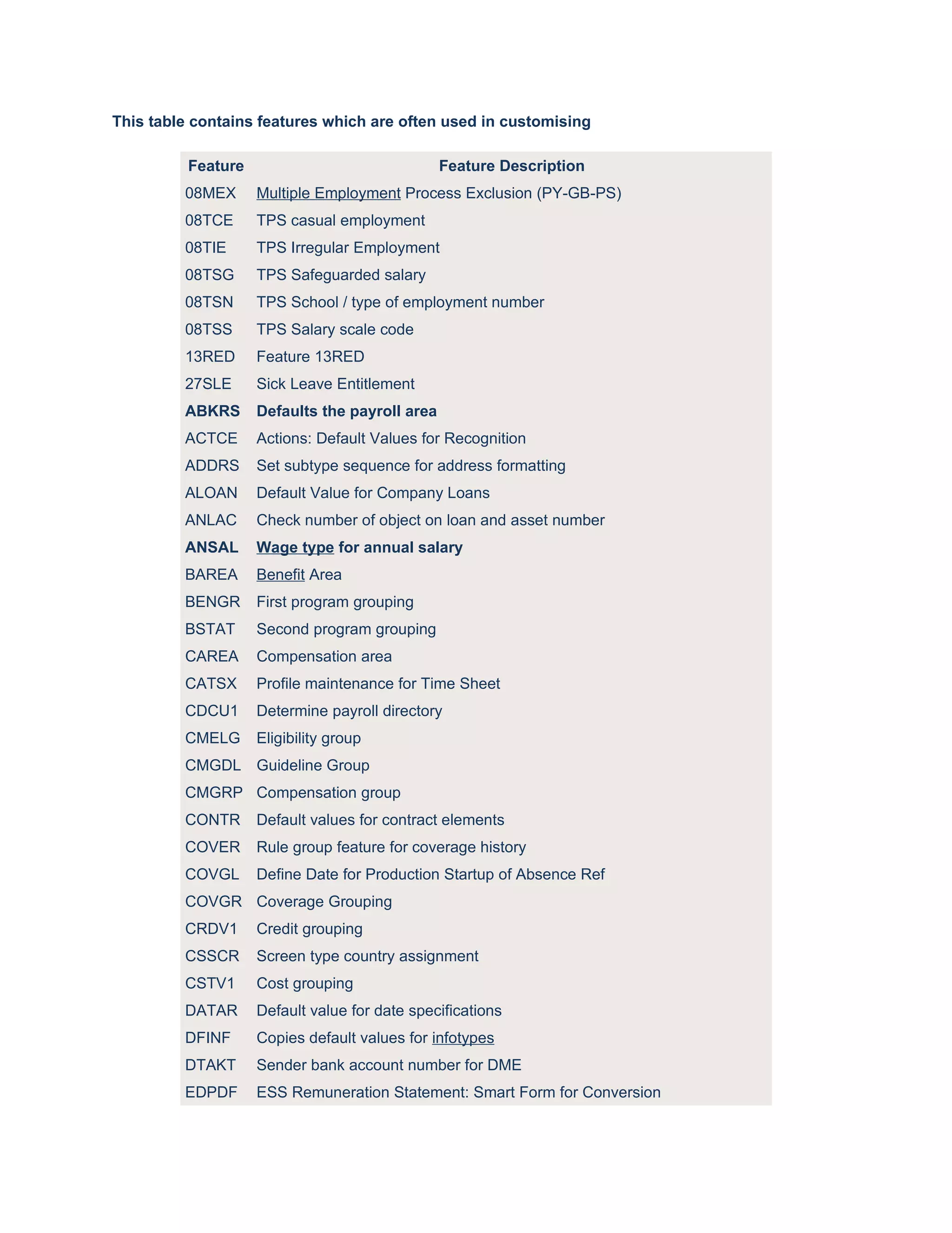 This document provides information about features that are often used to customize SAP systems, including a table listing many features with their descriptions and hints and tips for working with features.