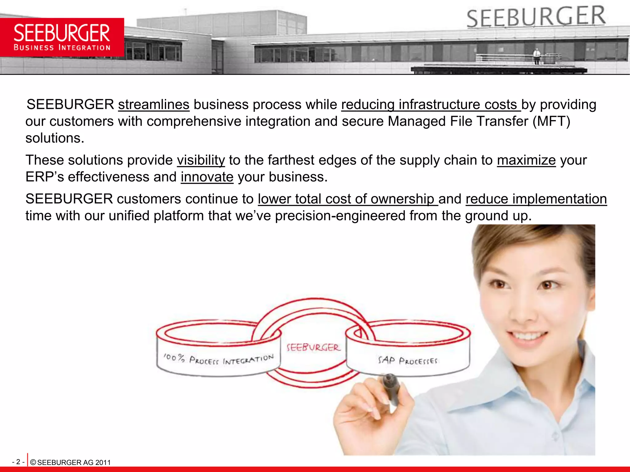 This document discusses how SEEBURGER provides managed file transfer solutions to securely transfer data between business applications and partners. It defines managed file transfer and outlines how SEEBURGER's solutions provide visibility, security, compliance, and automation to streamline business processes while reducing costs. The document also provides examples of SEEBURGER implementing managed file transfer solutions for oil and gas, manufacturing, and banking customers using SAP and other systems.