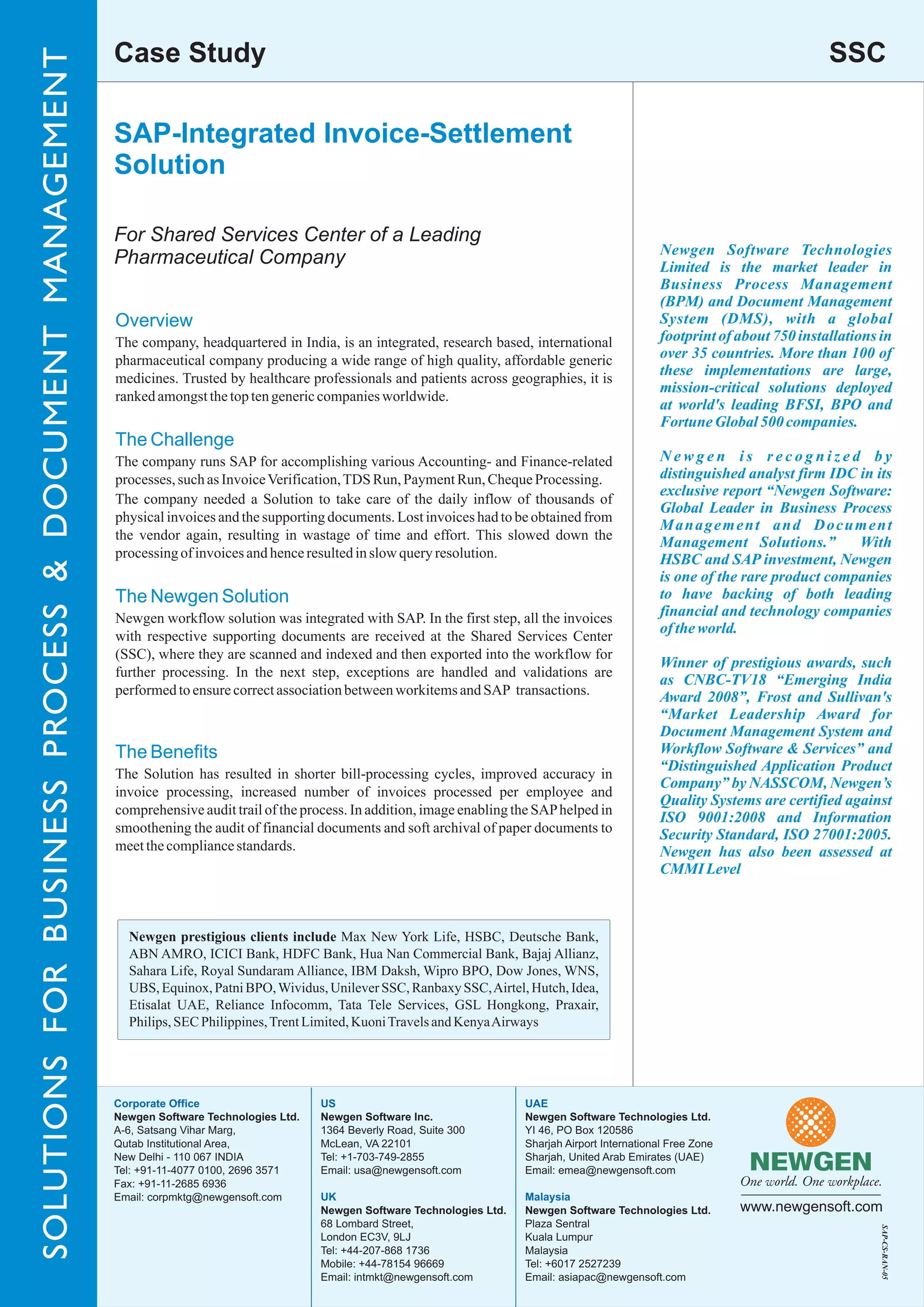 The document discusses a case study of Newgen Software Technologies Limited providing an invoice settlement solution integrated with SAP for a leading pharmaceutical company. The solution digitized the invoice processing workflow to address challenges of lost paperwork and slow processing. Key benefits included shorter billing cycles, improved accuracy, and an audit trail for financial compliance. The solution demonstrated Newgen's expertise in business process management and document management systems.