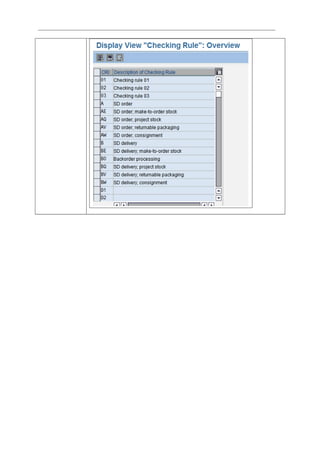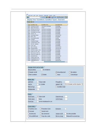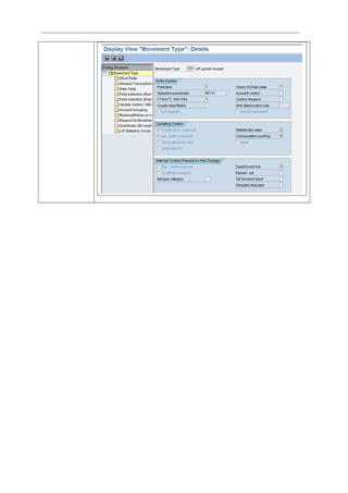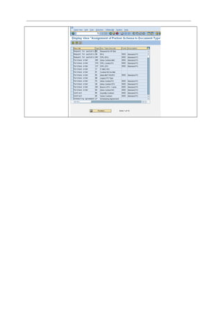 This document outlines the configuration steps needed to set up an SAP system for materials management. It includes defining things like plant locations, purchasing organizations, material types, MRP areas, document types for purchasing documents, text types, number ranges, and more. The goal is to structure the system's enterprise setup and enable key purchasing, inventory, and planning functionality.