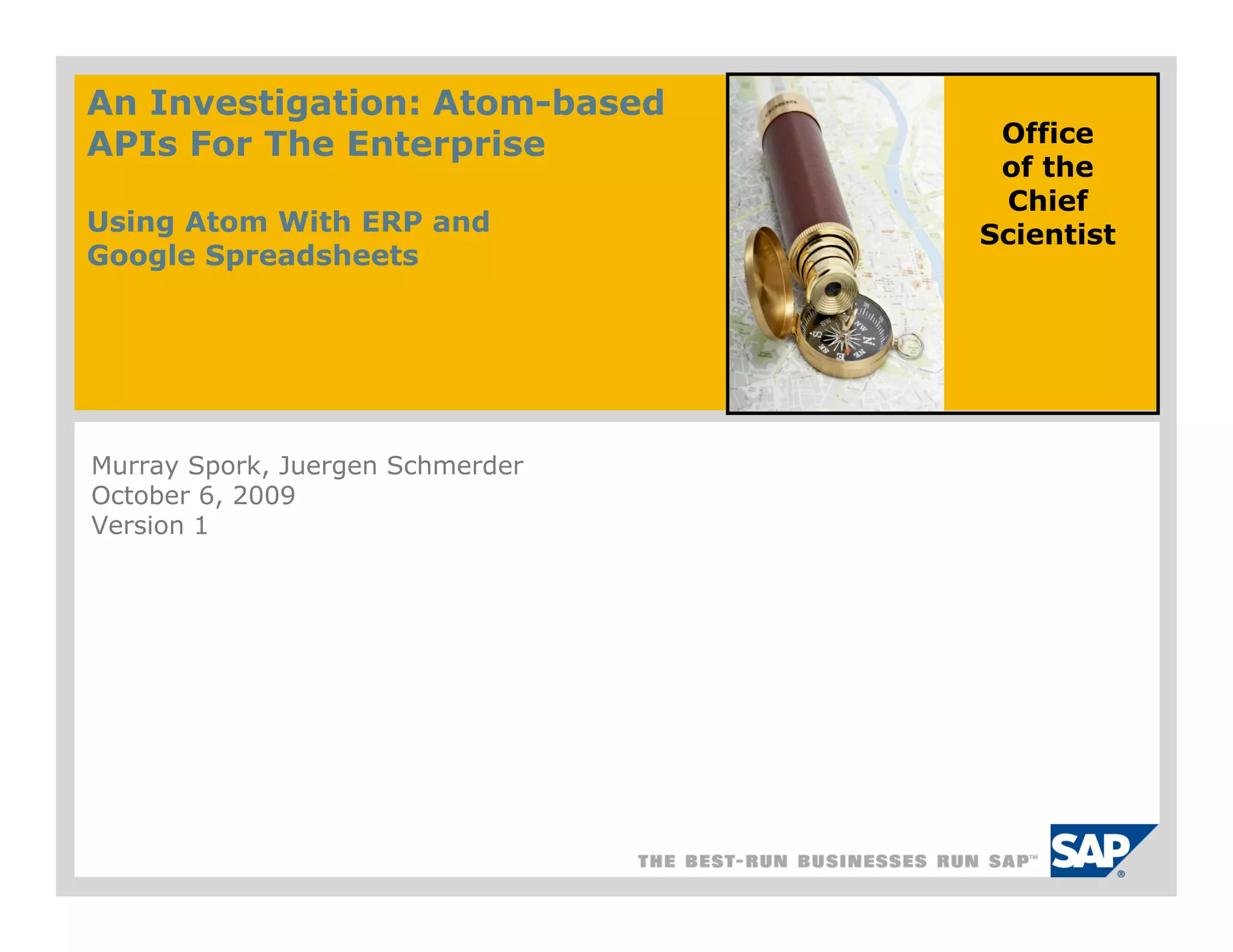 The document discusses the adoption of Atom APIs in enterprise environments, highlighting their advantages over REST APIs, particularly in interoperability and structured data representation. It outlines Atom's capabilities as a web syndication format, its significance for ERP systems, and the lessons learned from practical implementations. Additionally, it identifies open issues and potential improvements for Atom that could enhance its usability in business applications.