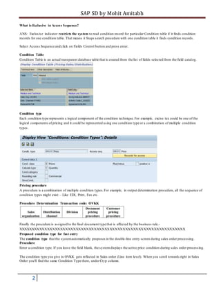 Condition technique is a configuration technique in SAP used to configure complex business rules, such as pricing. It consists of several key components, including a field catalog, condition tables, an access sequence, condition types, pricing procedures, and pricing procedure determination. Condition tables contain business rules and are accessed in the order specified by the access sequence. Condition types represent logical components like taxes or discounts. Pricing procedures combine condition types and are assigned to documents like sales orders. Overall, condition technique provides a rules engine for flexibly configuring diverse and changing business rules through its various components.