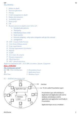This document discusses SAP and the process of implementing SAP software at a company. It describes SAP as an ERP software that provides solutions for all departments of an enterprise. It outlines the implementation process using the ASAP methodology, including project preparation, requirement gathering, and configuring the system. Key aspects covered are purchasing licenses, setting up the system landscape, infrastructure requirements, and consultant roles and responsibilities through each phase of implementation.