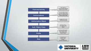 This document provides an overview of SAP security. It discusses key concepts like user master records, roles, profiles, and authorization objects which form the building blocks of SAP security. It also explains common terminologies and tools used in SAP security like user buffer, authorization errors, and security matrix. The document demonstrates how authorization checks work when executing a transaction in SAP and lists some standard SAP password controls. It introduces the Central User Administration feature and provides examples of common security tools in SAP.
