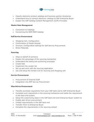 The document outlines the SAP SRM course content, covering topics such as system landscape, integration scenarios, procurement processes, and user management. It includes details on enterprise buyer architecture, self-service procurement, and plan-driven procurement. Additionally, it addresses administration principles and document reporting within SAP SRM.
