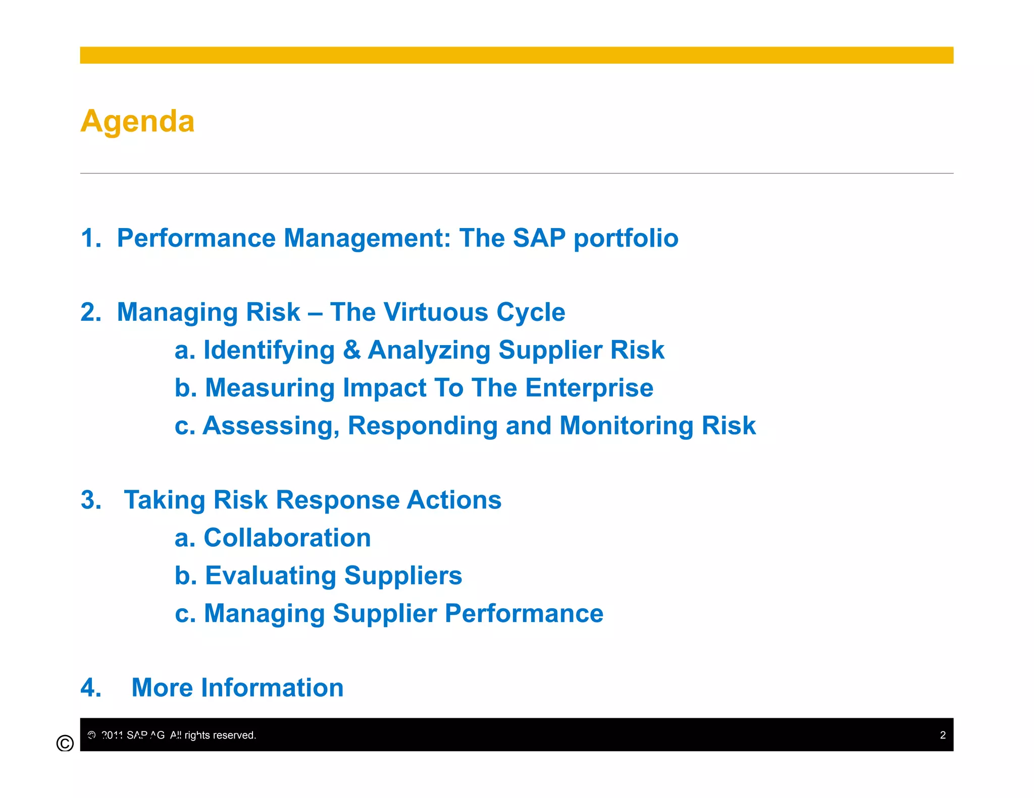 The document discusses performance and risk management strategies presented by Henner Schliebs to an analyst briefing. It outlines an agenda covering SAP's portfolio for performance management, managing risk through a virtuous cycle of identifying, analyzing, and monitoring supplier risk, and taking risk response actions. The virtuous cycle involves establishing risk thresholds, collaborating to aggregate supplier risks, and deriving short-term actions from long-term strategies. SAP solutions aim to provide end-to-end visibility and management of risks and performance across the enterprise.