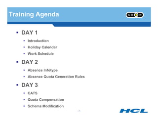 The document provides an overview of SAP's Personnel Time Management module. It discusses key infotypes and customizing steps for setting up time quotas, work schedules, public holidays, and substitutions. The training agenda covers absence management, CATS, schema modification, and simulated infotypes for viewing employee time and labor data. Screenshots illustrate examples of personnel subarea groupings, employee subgroup groupings, daily work schedules, period work schedules, and generating work schedules manually and through batch processing.