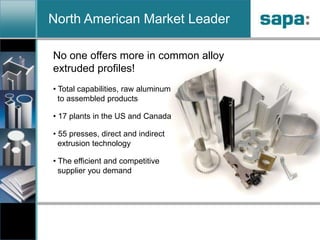 Sapa Extrusions is a leading North American supplier of extruded aluminum products. They have 17 plants across the US and Canada with 55 extrusion presses. Sapa offers a wide range of standard and custom extruded aluminum shapes, seamless and structural pipe and tube, and rod and bar. They provide complete solutions from raw aluminum to finished products across various markets including construction, automotive, and solar energy. Sapa has extensive fabrication, finishing, and technical support capabilities to meet customers' needs.