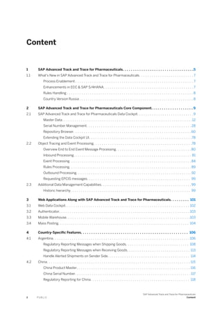 This document provides an overview of SAP Advanced Track and Trace for Pharmaceuticals. It describes the core components, including the data cockpit for master data and serial number management. It also covers object tracing, event processing, and additional data management capabilities. Country-specific features for regions like Argentina, China, the European Union, and the United States are detailed. Deployment models and integration with SAP ECC and SAP S/4HANA are discussed.
