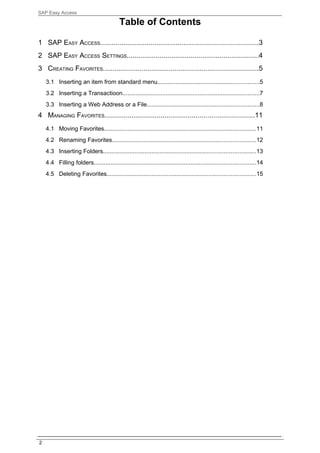 The document provides instructions for using SAP Easy Access to create, organize, and manage favorites. It describes how to add items from the standard menu, transactions, web addresses, and files to favorites. It also explains how to move, rename, insert folders for, fill folders with, and delete favorites and folders to organize items. The document is intended to help users get started using the SAP Easy Access menu functionality within 5 minutes.