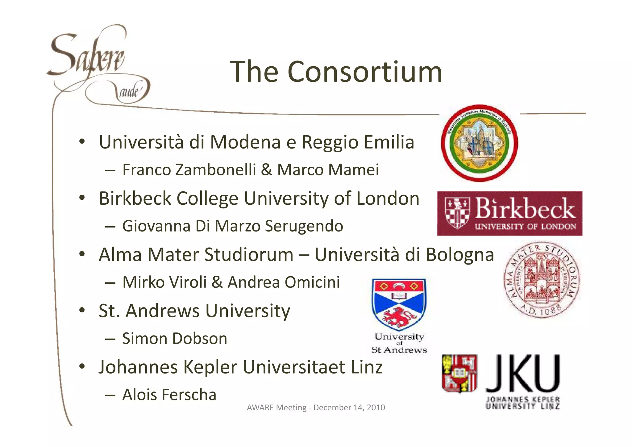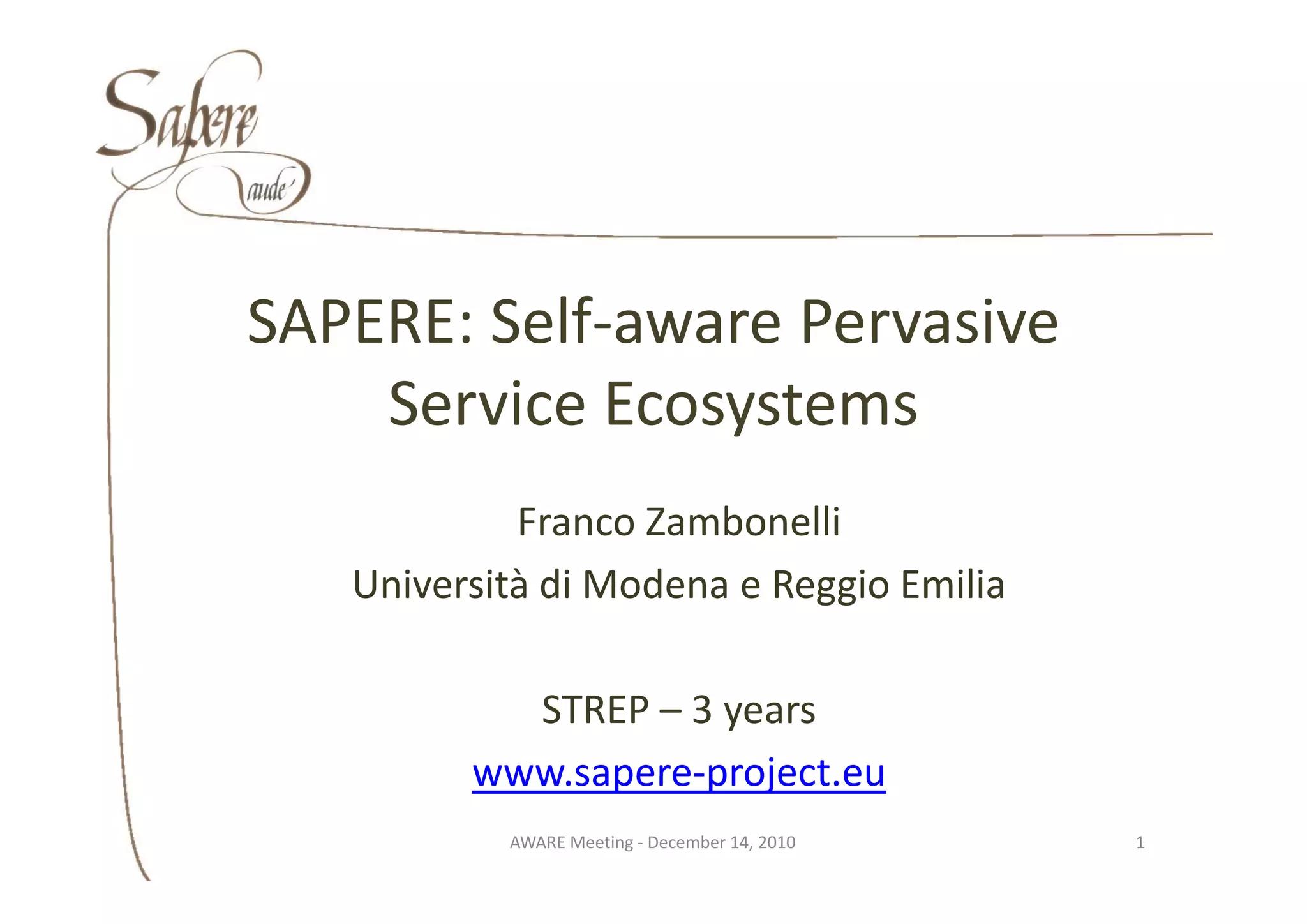 1) The SAPERE project aims to develop a theoretical and practical framework for pervasive service ecosystems that are highly adaptive and self-managing.