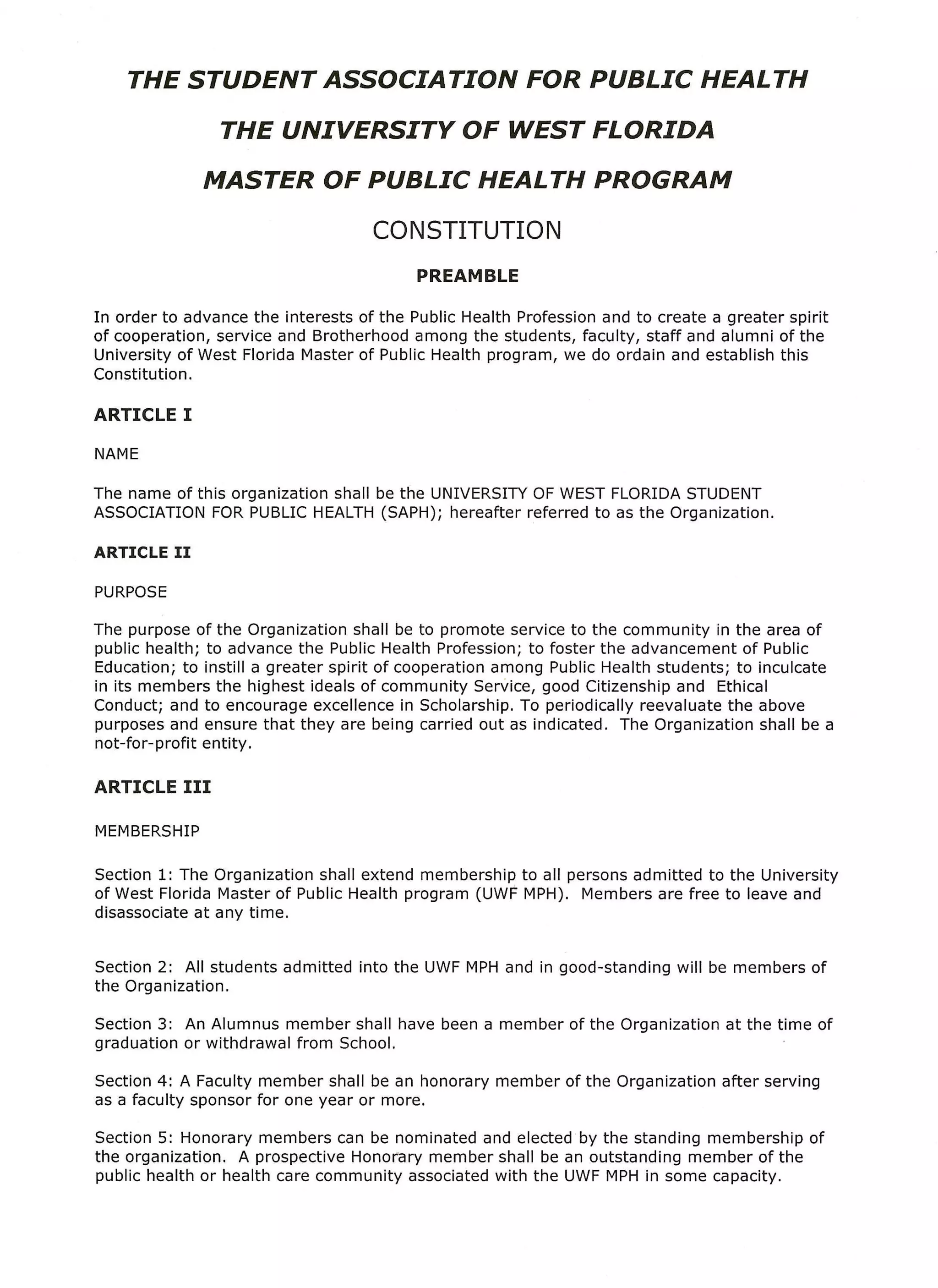 This document establishes the constitution for the University of West Florida Student Association for Public Health (SAPH). The purpose of SAPH is to promote public health in the community through service, advance the public health profession, foster public health education, and encourage excellence in scholarship among UWF's Master of Public Health students, faculty, staff and alumni. Membership is open to all UWF MPH students. The organization will be led by a President, Vice President and Treasurer/Secretary, and advised by a faculty member. It will meet quarterly and complete fundraising to support service activities. All activities of SAPH and its members will be non-discriminatory and in accordance with UWF rules.
