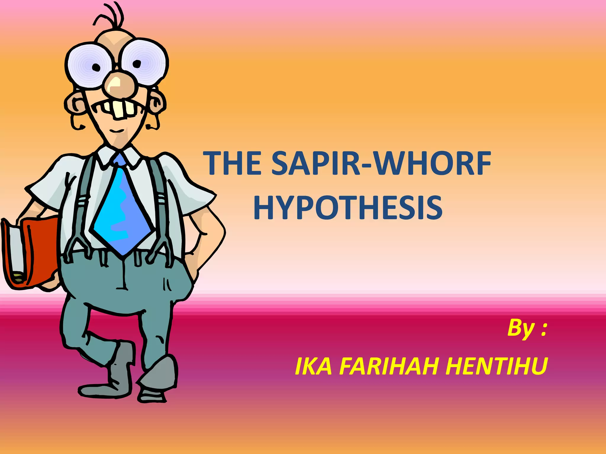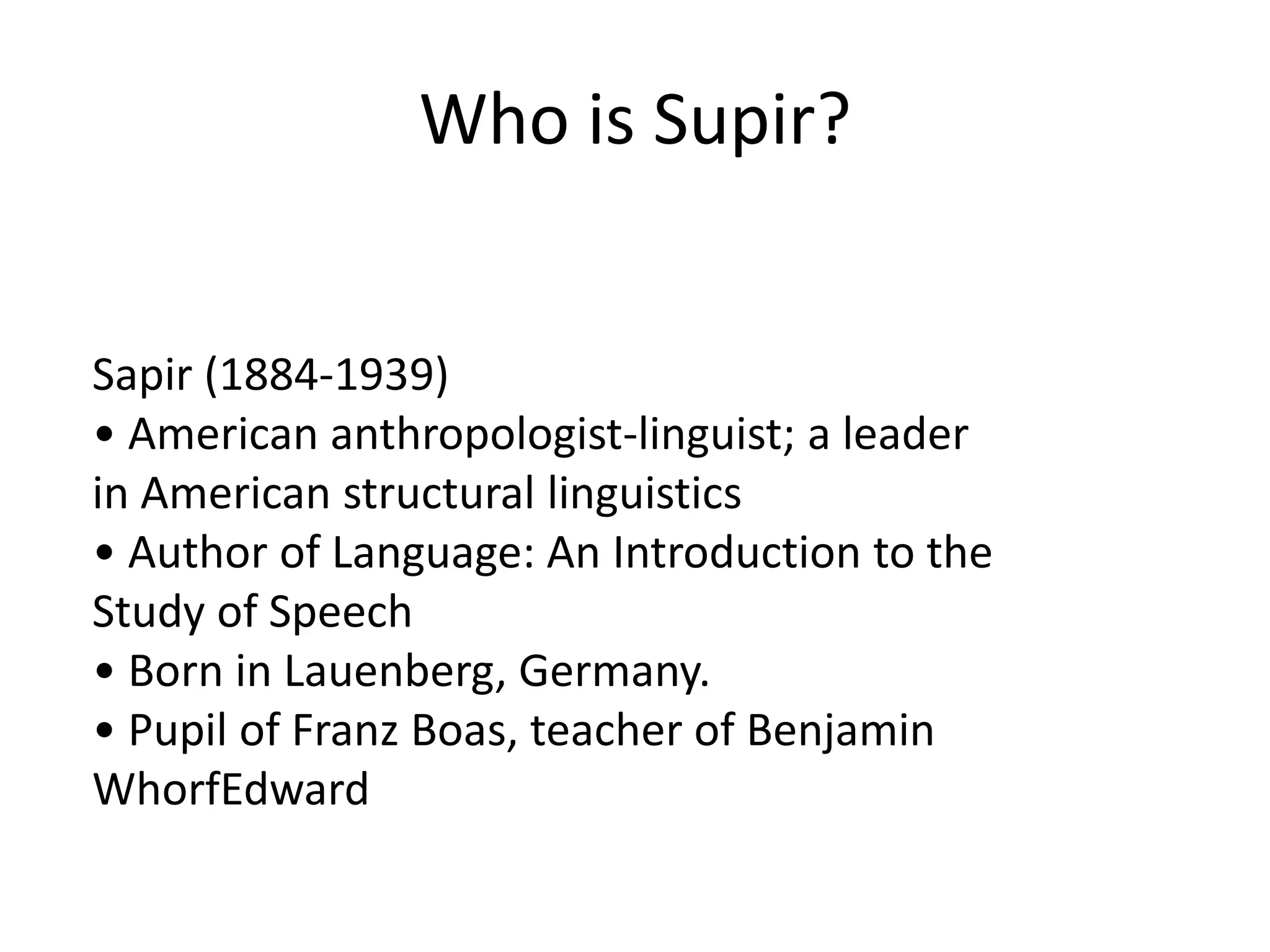 This document discusses the Sapir-Whorf hypothesis, which was first proposed by Edward Sapir and later expanded upon by Benjamin Lee Whorf. It presents the key figures and their backgrounds, including Sapir's work in linguistics and Whorf's study of the Hopi language. The hypothesis is introduced as having both a strong version, that language determines thought, and a weak version, that language influences thought. While heavily criticized, most linguists now accept the weak version to some degree. Examples are given of how language can reflect cultural differences in areas like kinship terminology. The conclusion is that while the extreme versions have been disproven, most agree there is some influence of language on thought.