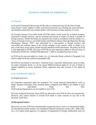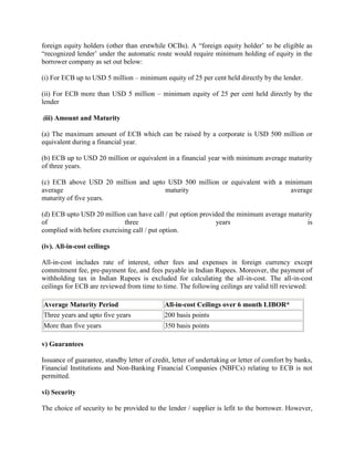 This document outlines India's External Commercial Borrowing (ECB) policy, which allows Indian companies to borrow funds in foreign currency from non-resident lenders with minimum maturities of 3 years. There are two routes for ECB - Automatic and Approval. The Automatic Route allows eligible corporates to borrow up to $500 million annually from recognized lenders at specified all-in-cost ceilings. The Approval Route requires RBI approval and allows additional borrowing or relaxation of certain criteria. Borrowers must report ECB deals to RBI for monitoring and dissemination.
