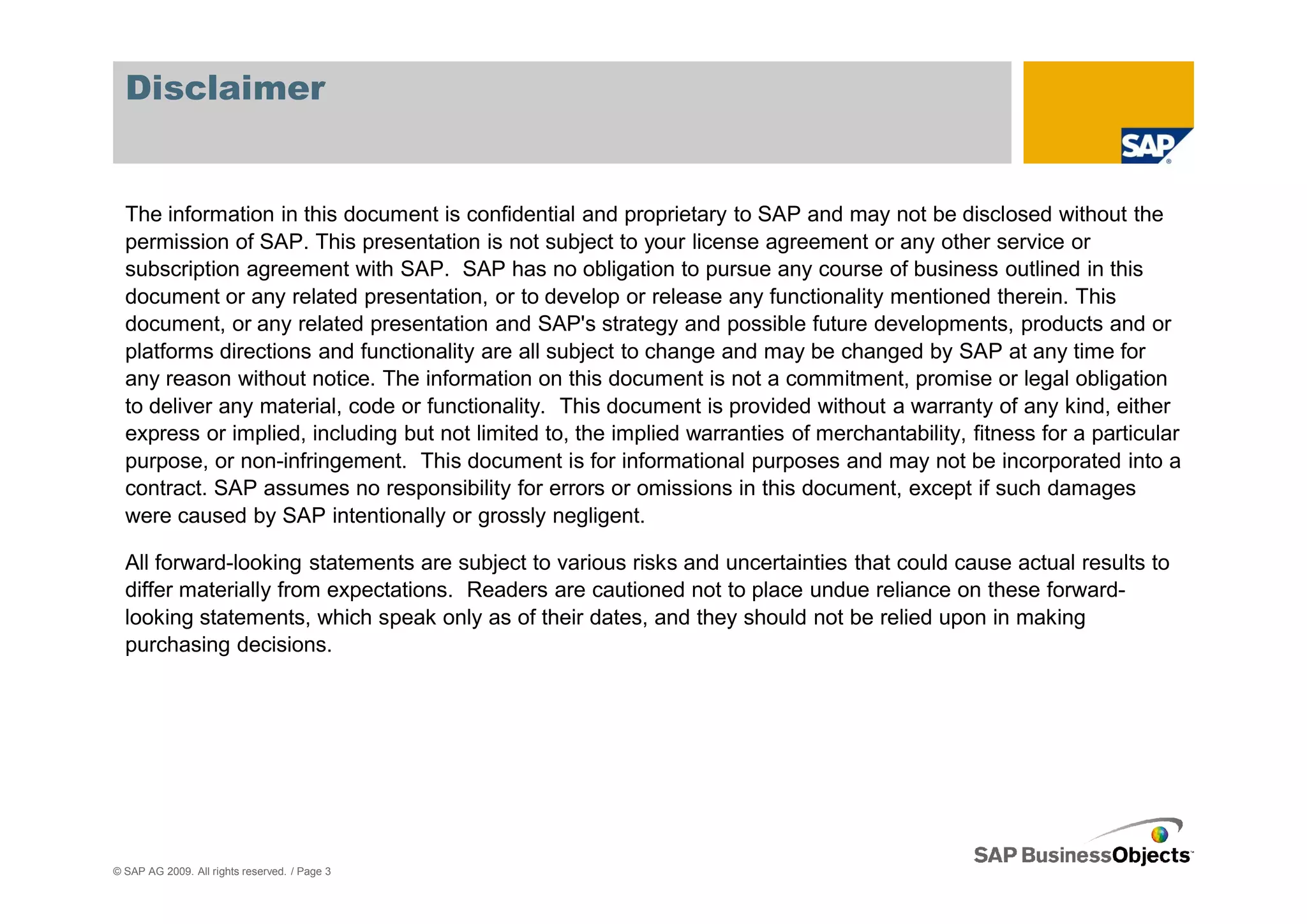 The document discusses extending the value of SAP solutions with the SAP BusinessObjects business intelligence platform. It outlines SAP's acquisition of Business Objects to provide customers a full BI and IM suite on one platform with deep integration to SAP products. The agenda covers product integration roadmaps for visualization, reporting, analysis, data warehousing, accelerated BI, and embedding business content in processes. It positions SAP NetWeaver and SAP BusinessObjects as a leader in BI by providing an open, user-centric platform that delivers trusted information from any source to all employees.