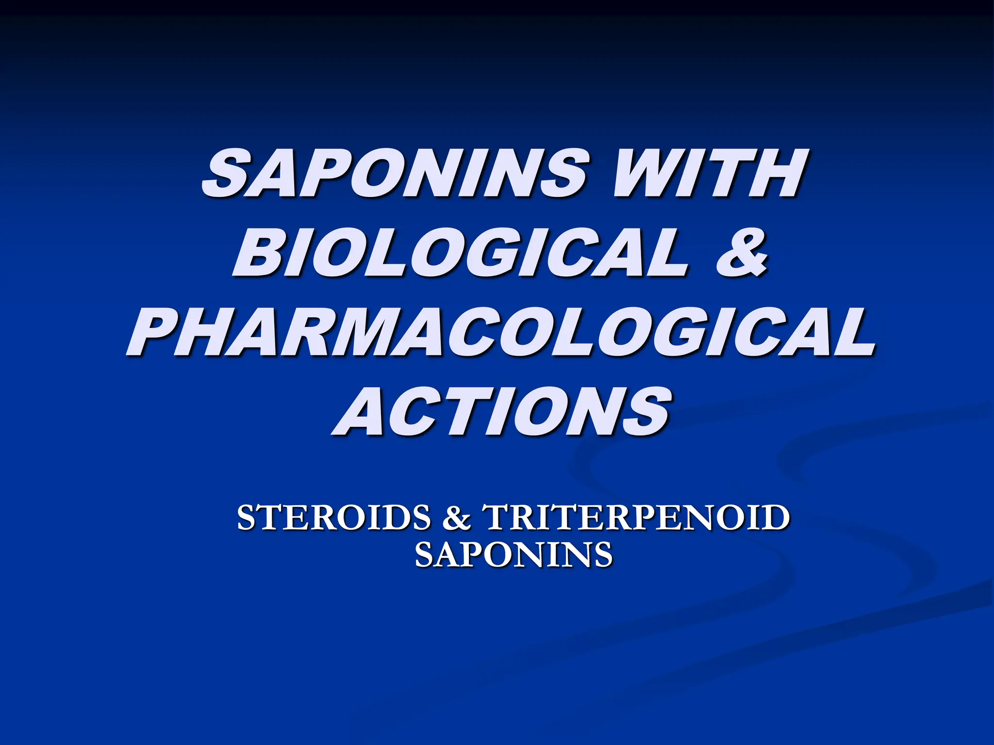 The document discusses the classification, biosynthesis, biological actions, and pharmacological properties of saponins, which are glycosides with foaming characteristics found in various plants. Saponins are noted for their cholesterol-reducing abilities, immune-boosting properties, and potential anticancer effects, among other benefits. Additionally, examples of specific plants containing saponins, such as Dioscorea, Fenugreek, and Ginseng, are provided along with their respective medicinal uses and properties.