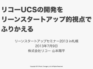 Company, Ltd. All Rights Reserved. リコーUCSの開発を リーンスタートアップ的視点で ふりかえる リーンスタートアップセミナー2013 in札幌 2013年7月9日 株式会社リコー 山本陽平 1