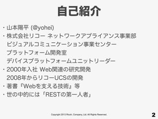 Company, Ltd. All Rights Reserved. 自己紹介 ・山本陽平 (@yohei) ・株式会社リコー ネットワークアプライアンス事業部 ビジュアルコミュニケーション事業センター プラットフォーム開発室 デバイスプラットフォームユニットリーダー ・2000年入社 Web関連の研究開発 2008年からリコーUCSの開発 ・著書『Webを支える技術』等 ・世の中的には「RESTの第一人者」 2