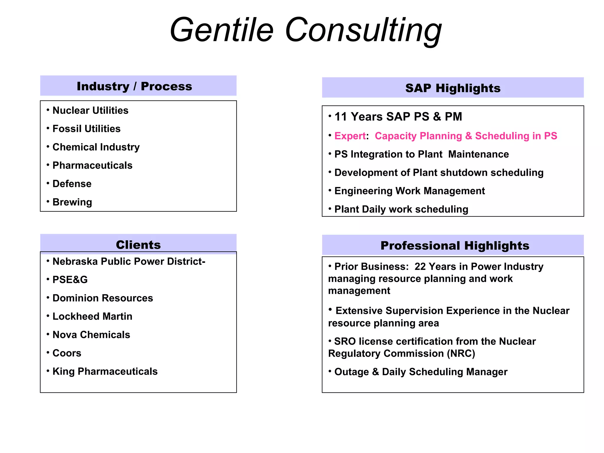 The document discusses Gentile Consulting and their expertise in SAP Plant Maintenance (PM) and Production Scheduling (PS) solutions for utilities and other process industries. Key points include Gentile's 11 years of experience with SAP PS and PM modules, their focus on capacity planning and scheduling, and experience managing scheduling and resource planning for nuclear and fossil fuel power plants. The document also outlines the benefits of integrated scheduling in SAP PS and PM, such as visibility across the enterprise and improved schedule adherence.