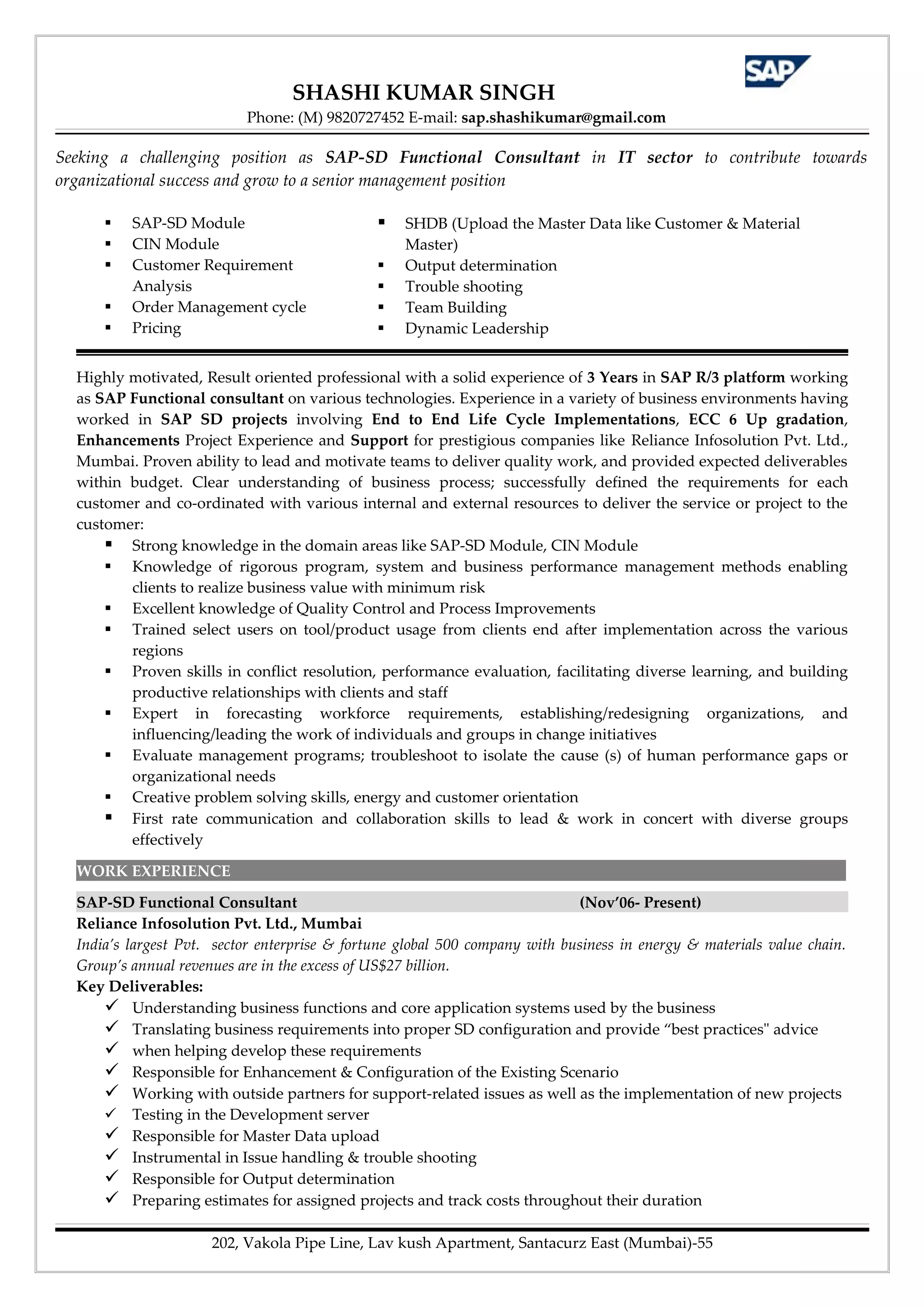 Shashi Kumar Singh is seeking a position as an SAP-SD functional consultant. He has over 3 years of experience working with SAP R/3 as a functional consultant. He is proficient in SAP-SD, CIN, output determination, and troubleshooting. Singh has experience leading projects for companies like Reliance Infosolution involving implementations, upgrades, enhancements, and support. He is motivated, results-oriented, and has strong communication and problem-solving skills.