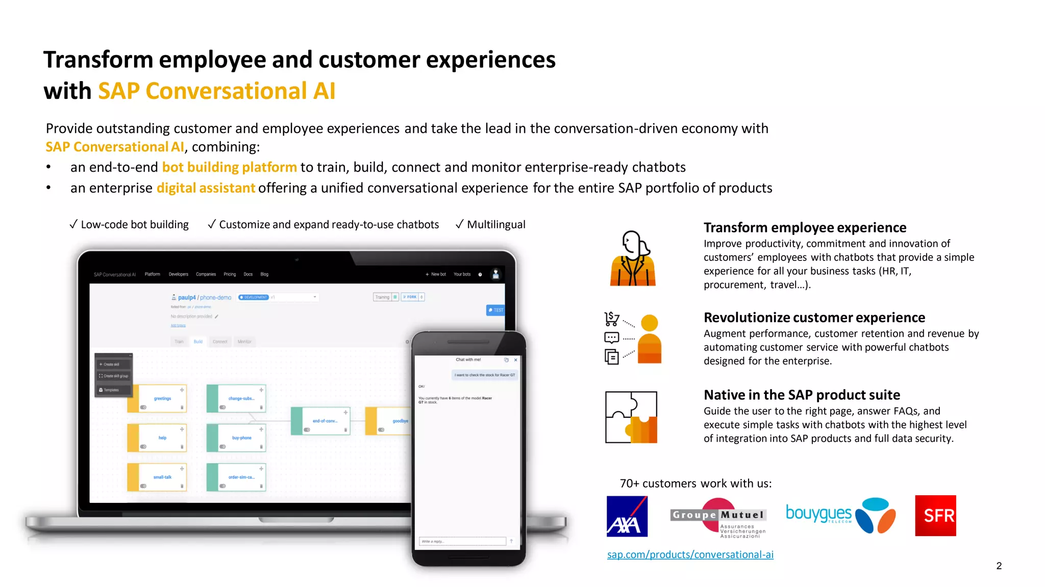 Skybuffer's Intelligent Decision Dimensions is an SAP-certified add-on designed to enhance enterprise operations through conversational AI, enabling automation for customer service and improving employee productivity. The solution integrates seamlessly with SAP products, supporting over 400 business scenarios and a hybrid communication model, allowing voice and text interactions via popular platforms like WhatsApp and Microsoft Teams. Additionally, it features low-code bot development, quick deployment, and a strong focus on user-centered experiences, significantly reducing implementation costs and time.