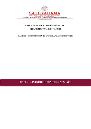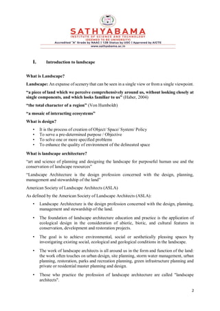 This document provides an introduction to landscape architecture. It defines key terms like landscape, design, and landscape architecture. It explains that landscape architecture is concerned with the planning, design, management, and stewardship of land. The document also outlines the various fields that inform landscape architecture, including behavioral sciences, general sciences, and engineering/technology. It then discusses different types of landscapes like natural habitats, artifacts, and systems. Finally, it covers common landscape elements like hardscapes, softscapes, pavements, fences, retaining walls, and pedestrian bridges.