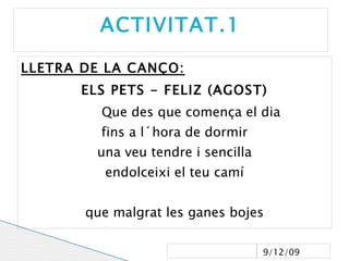 ELS PETS -FELIZ (AGOST) Que des que comença el dia fins a l´hora de dormir una veu tendre i sencilla endolceixi el teu camí que malgrat les ganes bojes de trucarte que ara tinc cap paraula cap penyora entorpeixi el teu destí que la sort que ara et gira l´esquena et retorni l´amor que fins ara has donat que les hores compartides et provoquin un somris ara que ja no m´estimes tant de bo siguis feliç ara que ja no m´estimes per favor sigues feliç - La canço tracta de la feliçitat i l’amor ACTIVITAT.1