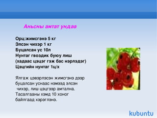 Аньсны цэвэр шүүсОрц:жимсгэнэ 2 кг Ус 200 гр Энэ шүүсийг бэлтгэхдээ шинэ жимсгэнээс гадна хөлдөөсөн жимсгэнэ хэрэглэж болно.Жимсгэнэ цэвэрлээд нухаж,дээрээс нь ус нэмээд 80 хэмд сайн халаана.Буцалгах шаардлагагүй. Дараа нь сайтар нухаж шүүгээд ариутгасан шилэнд хийж хөргөж хадгална.Хөлдөөсөн жимсгэнийг бага зэрэг гэсгээгээд сайтар нухаж хийнэ.Амт оруулахын тулд элсэн чихэр,нимбэгний хүчил хийж болно. - 4.