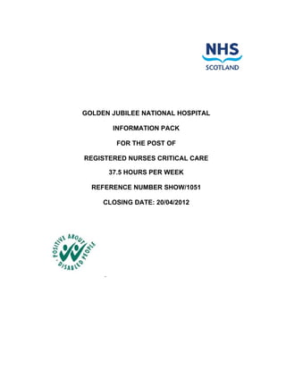 This document provides information for a registered nurse critical care position at the Golden Jubilee National Hospital in Scotland. It includes an overview of the hospital, job description, terms and conditions, and benefits information. The position involves assessing, planning, implementing, and evaluating care for critically ill patients. Duties include technical nursing tasks, record keeping, leadership, and developing skills. The hospital offers a pension scheme, paid time off, parking, and other benefits. The deadline to apply is April 20, 2012.