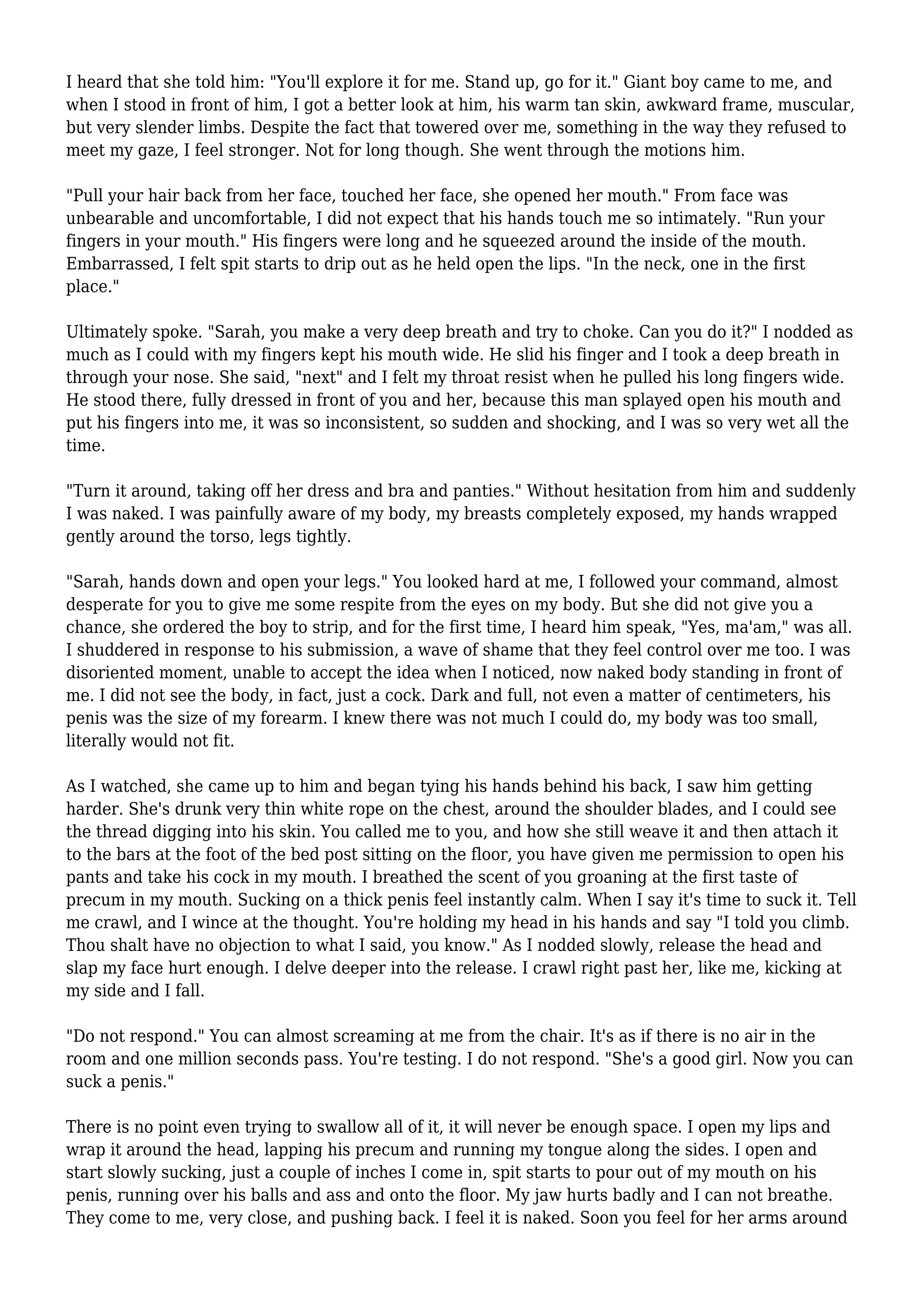The document describes a complex and intimate scene involving Sarah, a couple, and their interactions during a sexual encounter. It details Sarah's feelings of vulnerability, submission, and embarrassment, as she navigates the dynamics of power and control with both her partner and another man. The narrative explores themes of desire, shame, and the physical sensations experienced throughout the encounter.
