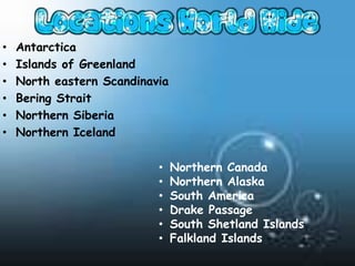 The document summarizes key details about the Arctic tundra biome. It describes the extreme seasonal differences, with summer temperatures reaching 12°C but winter temperatures plunging to as low as -70°C. Approximately 1700 plant species have adapted to survive the harsh conditions of the tundra. Several animal species also live in the tundra, including Arctic foxes, caribou, lemmings, and polar bears. The document provides examples of plant and animal species found in the Arctic tundra biome.