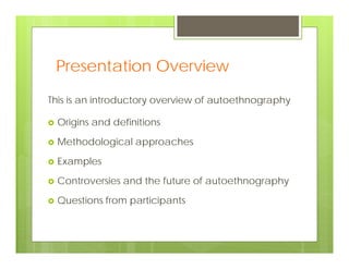 This document provides an overview of autoethnography as presented in a webinar by Dr. Sarah Wall. It discusses the origins and increasing popularity of autoethnography, definitions, methodological approaches, examples of analytic and evocative styles, controversies regarding criticisms of self-indulgence and lack of rigor, and ethical considerations. Autoethnography is presented as a method that values diverse ways of knowing and gives voice to marginalized groups' experiences.