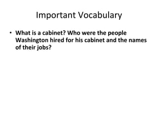 George Washington appointed the first cabinet, including Alexander Hamilton as Secretary of the Treasury, Thomas Jefferson as Secretary of State, and others. Hamilton advocated for a loose interpretation of the Constitution to allow the national bank, while Jefferson favored a strict interpretation. Washington also issued a Neutrality Proclamation to stay out of European wars after 1793. His farewell address warned against going into debt.
