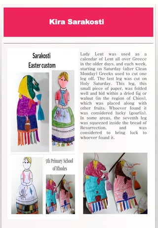 Kira Sarakosti is an old Greek Easter tradition represented by a small paper or bread figure of a nun-like woman with seven legs. Each leg represents one week of Lent and the figure was used as a calendar to count down the weeks until Easter. In older times in Greece, one of the legs would be cut off each week starting from Clean Monday until only one leg remained on Holy Saturday. The final leg piece would be hidden in a dried fruit and brought luck to whoever found it. Thus, Kira Sarakosti served as a folkloric representation of Lent that has now mostly disappeared as a custom in Greece.