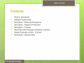 It describes everything about Sericulture (Silk Farming). Types of Sericulture. It's Historical Perspectives. Global production of Silk. How it can be done.What are the ways to do it.