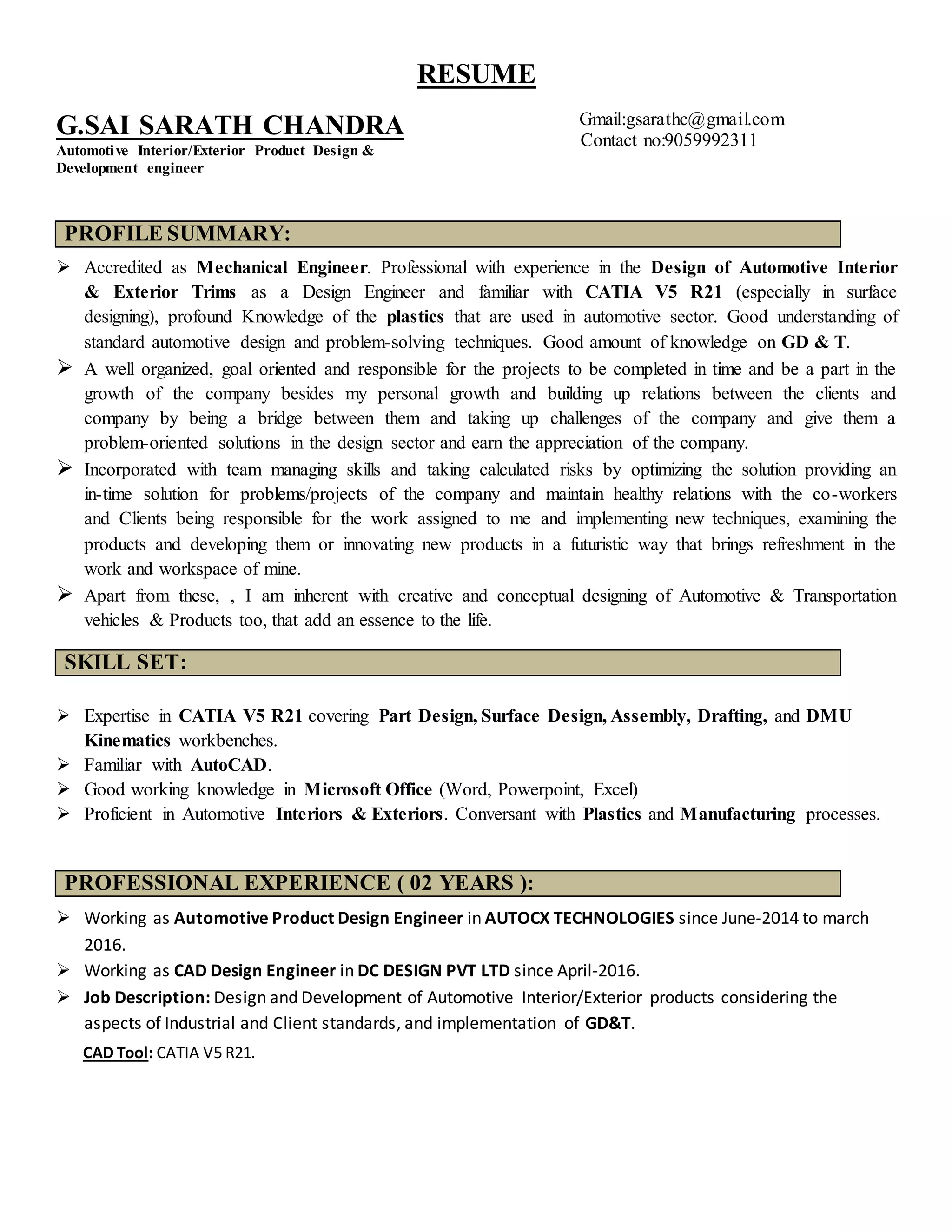 G. Sai Sarath Chandra is an automotive interior/exterior product design engineer with two years of experience in design and development, using CATIA V5 R21 and knowledgeable about plastics and GD&T. He has a B.Tech in Mechanical Engineering and core skills in managing design projects, improving processes, and client interactions. Sarath possesses strong creative and conceptual design abilities, aimed at contributing to both personal and company growth.