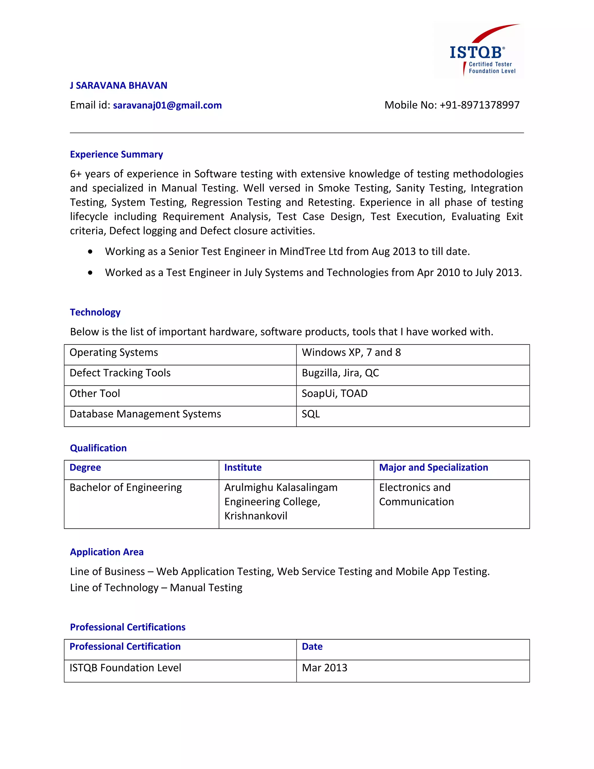 The document provides a detailed resume for a software testing professional with over 6 years of experience in manual testing, currently working as a Senior Test Engineer at Mindtree Ltd. It outlines their proficiency in various testing methodologies, roles in major projects for clients like Lexus and Avis, and includes personal details along with certifications. The resume showcases extensive knowledge of testing lifecycle phases, tools, and technologies used in web and mobile application testing.