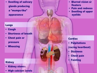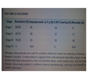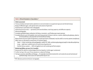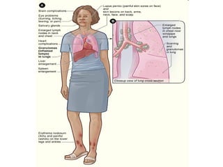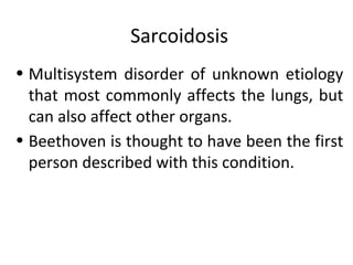 Sarcoidosis is a multisystem disorder characterized by noncaseating granulomas in affected tissues. It most commonly involves the lungs but can affect other organs. The cause is unknown but genetic and environmental factors are thought to play a role. Diagnosis is made through biopsy showing granulomas and excluding other causes. Treatment involves corticosteroids for organ involvement. Prognosis is generally good with remission occurring within 3 years for over half of patients.