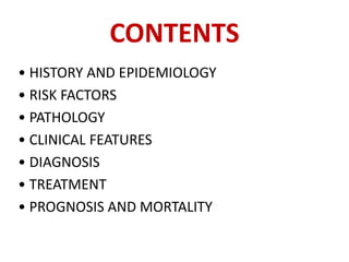 Sarcoidosis is a multisystem granulomatous disorder of unknown etiology characterized by non-caseating granulomas. It most commonly affects the lungs presenting as bilateral hilar lymphadenopathy and pulmonary infiltrates. Extrapulmonary involvement can include the skin, eyes, liver and musculoskeletal system. Diagnosis involves clinical features and exclusion of other causes. Treatment involves corticosteroids while prognosis depends on organ involvement with lung fibrosis carrying the worst prognosis.