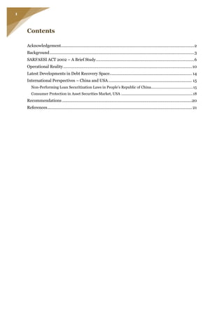 This document provides a summary of the SARFAESI Act of 2002 and the evolution of debt recovery systems in the Indian banking sector. It discusses how non-performing assets piled up in the sector due to inadequate debt recovery mechanisms and long civil court processes. This led to various committees and reforms over time to improve recovery of debts, including the establishment of Debt Recovery Tribunals, introduction of prudential norms, and reductions in statutory reserve requirements. A key reform was the enactment of the SARFAESI Act in 2002, which allowed banks and financial institutions to enforce security interests without court intervention.