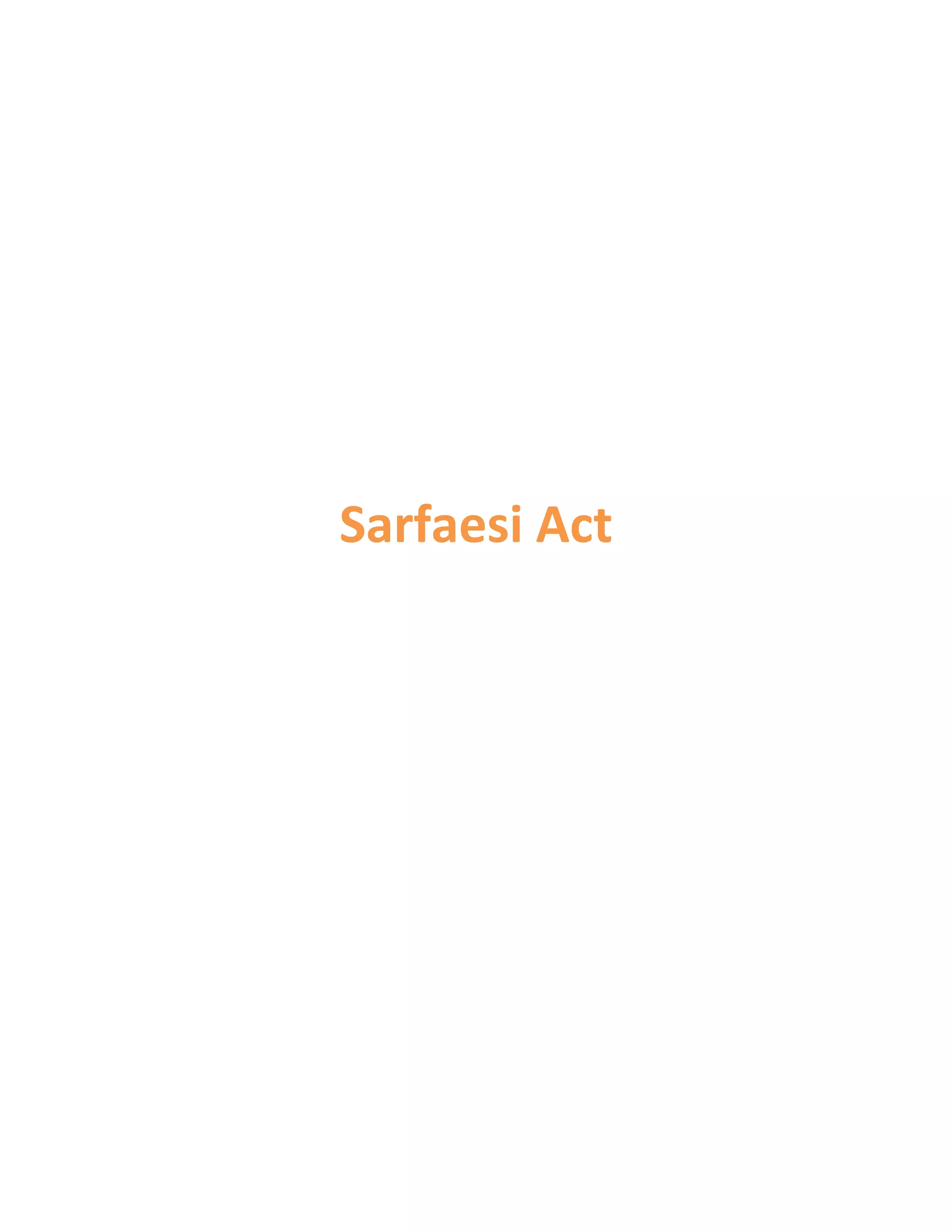 The SARFAESI Act allows banks and financial institutions to recover non-performing assets without court intervention through securitization, asset reconstruction, or enforcing security interests. The Act applies to NPA loans over Rs. 1 lakh and allows banks to issue demand notices, recover secured assets from borrowers or their transferees, and collect payments from debtors. Borrowers can appeal enforcement actions but must first deposit 50% of dues and cannot approach regular civil courts.