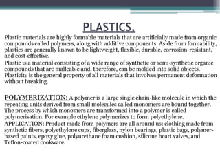 The document is a final report on plastic materials, detailing their properties, manufacturing processes, including injection molding, blow molding, compression molding, thermoforming, and rotational molding. It covers types of plastics, their applications, and advantages of different molding techniques. The report also highlights various plastics such as thermoplastics, thermoset plastics, and specific materials like acrylic, polystyrene, and fiberglass.
