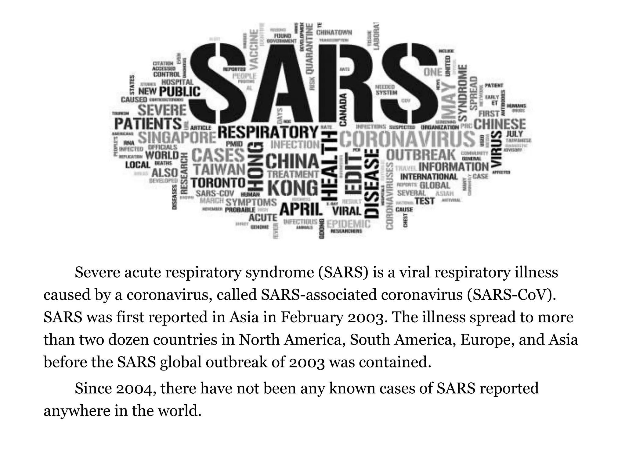 SARS is a viral respiratory illness caused by a coronavirus called SARS-CoV. It first emerged in Asia in 2003 and spread to over two dozen countries, causing a global outbreak, before being contained later that year. Since 2004, there have been no reported cases of SARS worldwide.