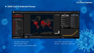 The document provides an overview of the SARS-CoV-2 virus, noting its emergence in late 2019 in Wuhan, China and its global spread. It discusses the virus structure, life cycle, and potential treatment strategies targeting both the virus and host response. Additionally, it outlines drug discovery services and development related to SARS-CoV-2, including vaccines and diagnostics.