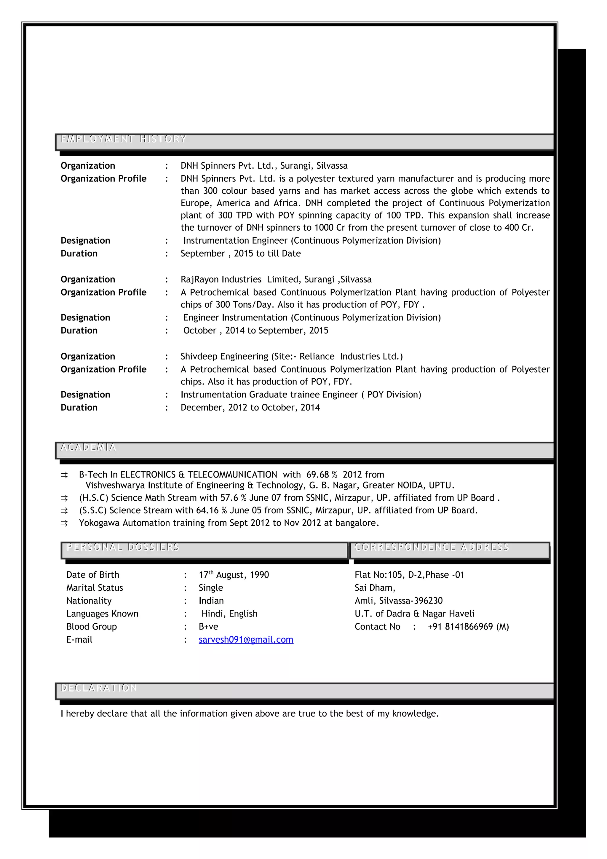 Sarvesh Kumar Singh has 4 years of experience in instrumentation for continuous polymer production plants. He has a B-Tech in Electronics and Telecommunication and completed a 3-month certification course in Yokogawa DCS. He currently works as an Instrumentation Engineer at DNH Spinners Pvt. Ltd. and has previously worked at RajRayon Industries Limited. He has expertise in DCS systems like Yokogawa Centum Vp, PLCs, drives, and various process instrumentation.
