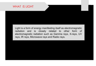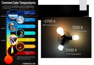 This document provides information on lighting design and different types of light sources. It discusses key lighting concepts like color temperature, lumens, footcandles and lux. It describes different types of lighting fixtures and luminaires. Common artificial light sources are covered, including incandescent lamps, fluorescent lamps, high intensity discharge lamps, and LEDs. Details are given on incandescent lamp construction and types, as well as tungsten-halogen and low-voltage lamps.