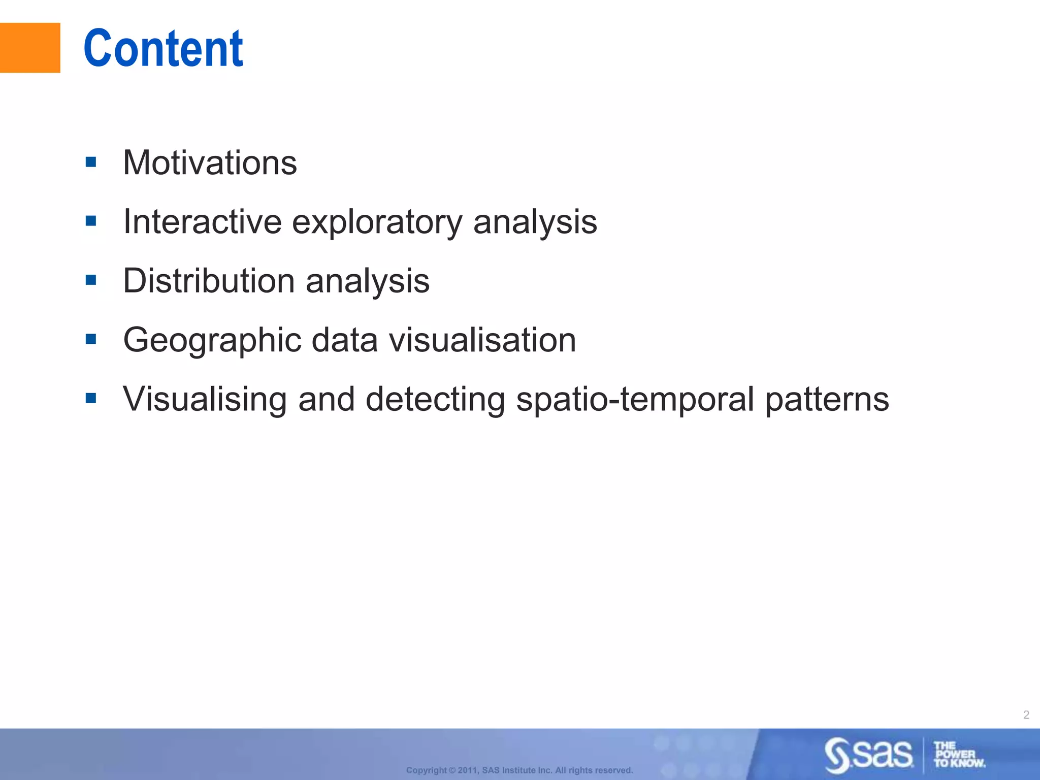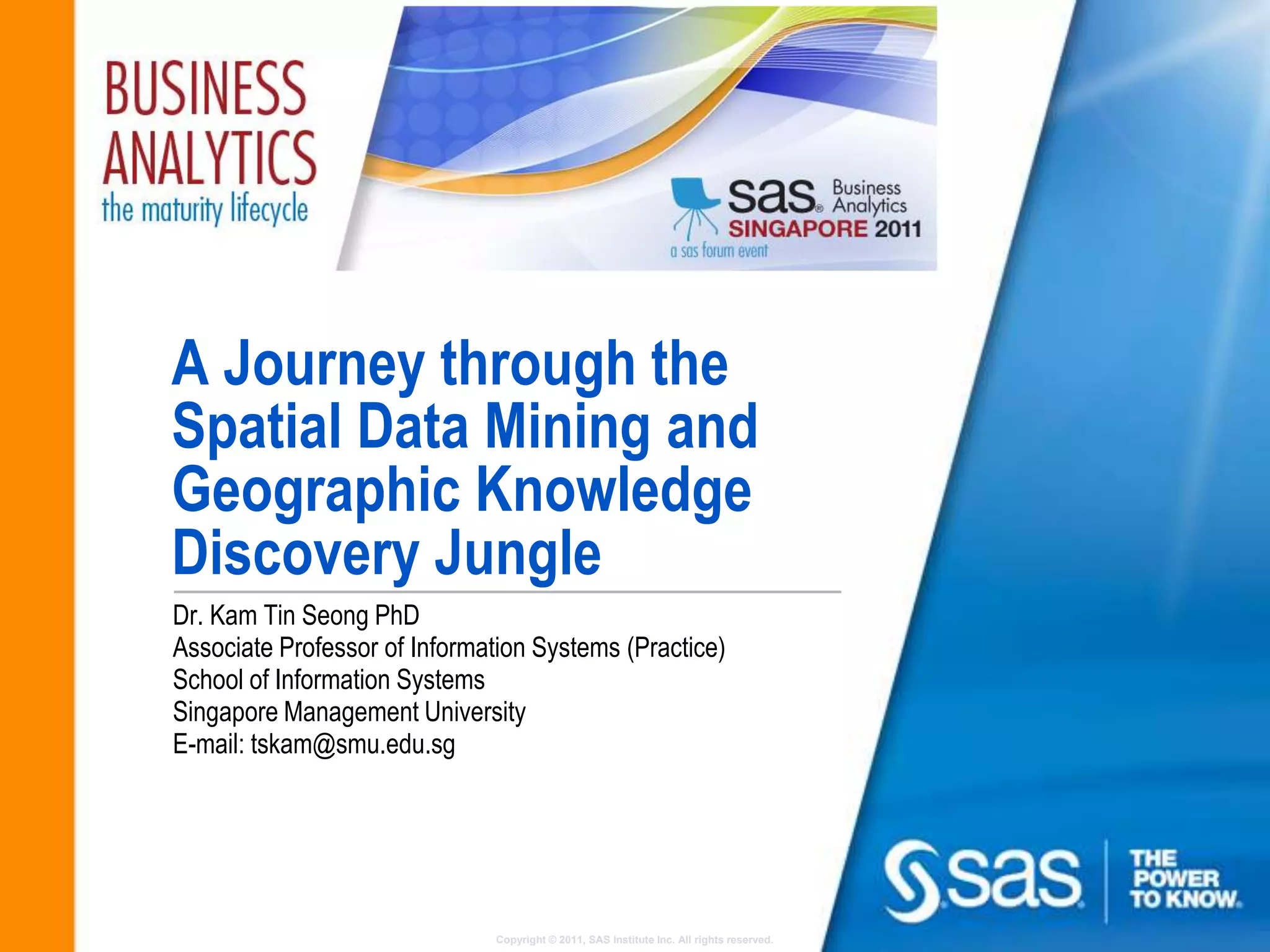 The document discusses spatial data mining and geographic knowledge discovery. It describes motivations like the availability of large geospatial datasets and lack of analysis tools. As a case study, it analyzes a one day taxi trip log with 53 variables through univariate and bivariate exploration, data cleaning, and deriving new variables. It explores various visualizations including interactive brushing, animated maps, trellis maps, and density maps to detect spatial and temporal patterns in the taxi trip data.