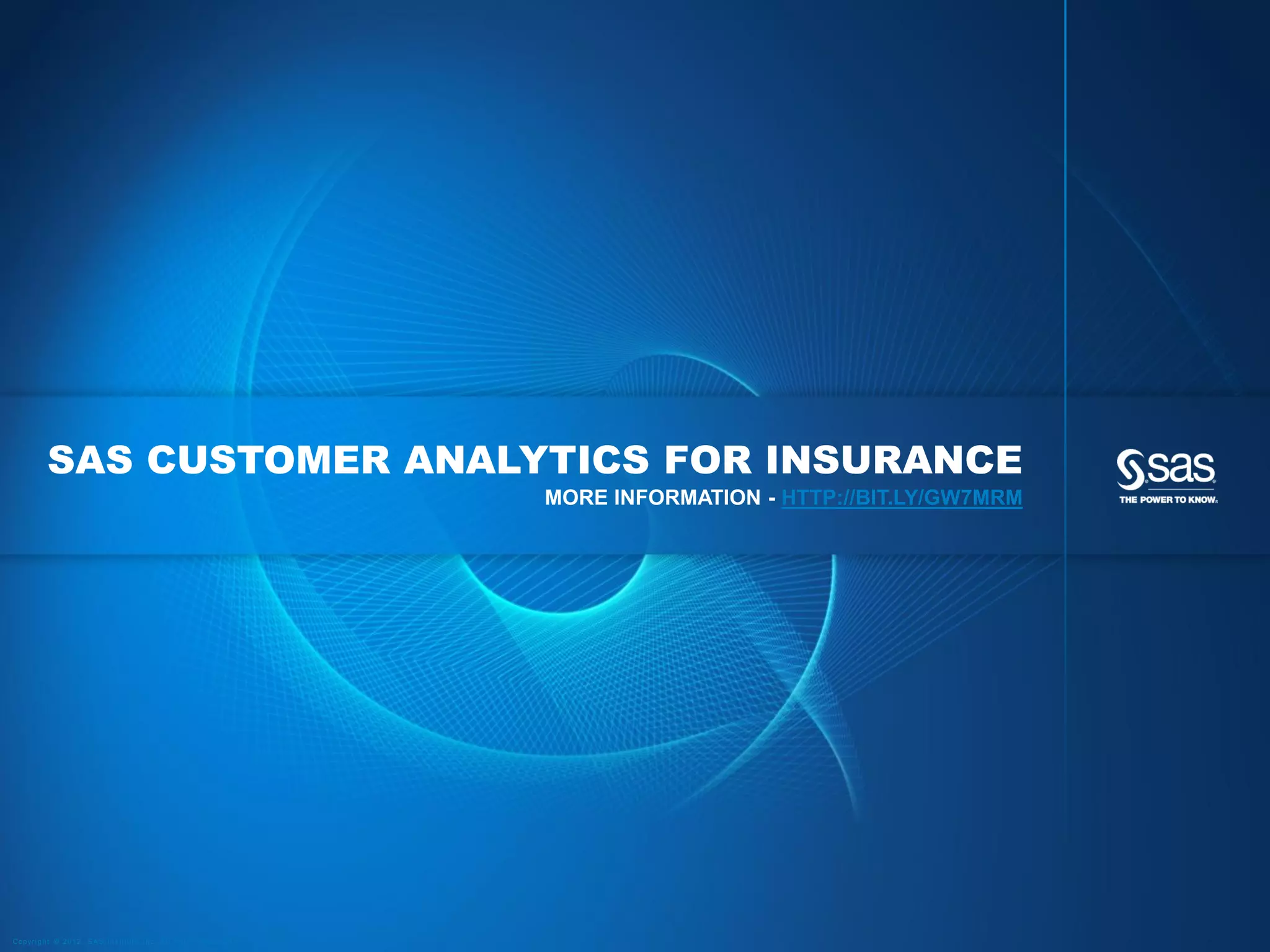 SAS Customer Analytics for Insurance offers a comprehensive solution for enhancing customer segmentation, retention, and sales in the insurance sector by providing integrated analytics, data management, and reporting tools. It focuses on creating a singular view of customer data to improve decision-making and operational efficiency, ultimately leading to increased retention rates and profitability. The platform includes capabilities for predictive modeling, customer scoring, and effective cross-sell and up-sell strategies.