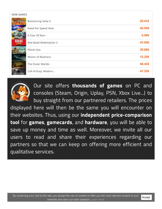The document provides a price comparison for various video games across multiple platforms, including PC, PS4, and Xbox One, along with promoting its service for users to save money and time. It encourages user feedback on partner retailers to improve service quality and includes a section on new game releases and gaming news. Additionally, it emphasizes cookie usage for personalized content and offers support for user inquiries.