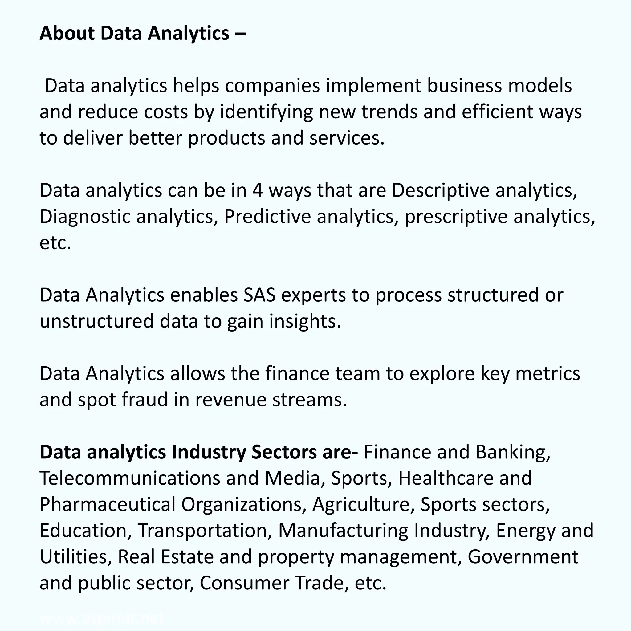 The document discusses the importance of data analytics in various industries, especially in banking and finance, highlighting how SAS software is utilized for business intelligence, predictive analytics, and risk management. It details the SAS financial data analyst certification program, including its prerequisites, courses, and job prospects. The document emphasizes the growing reliance on SAS tools for ensuring effective financial operations and adapting to technological changes in the sector.